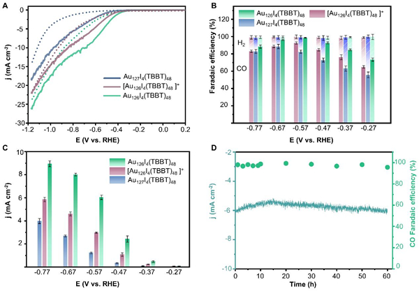 图4. Au127、Au126和[Au126]+的电催化CO2还原性能测试。