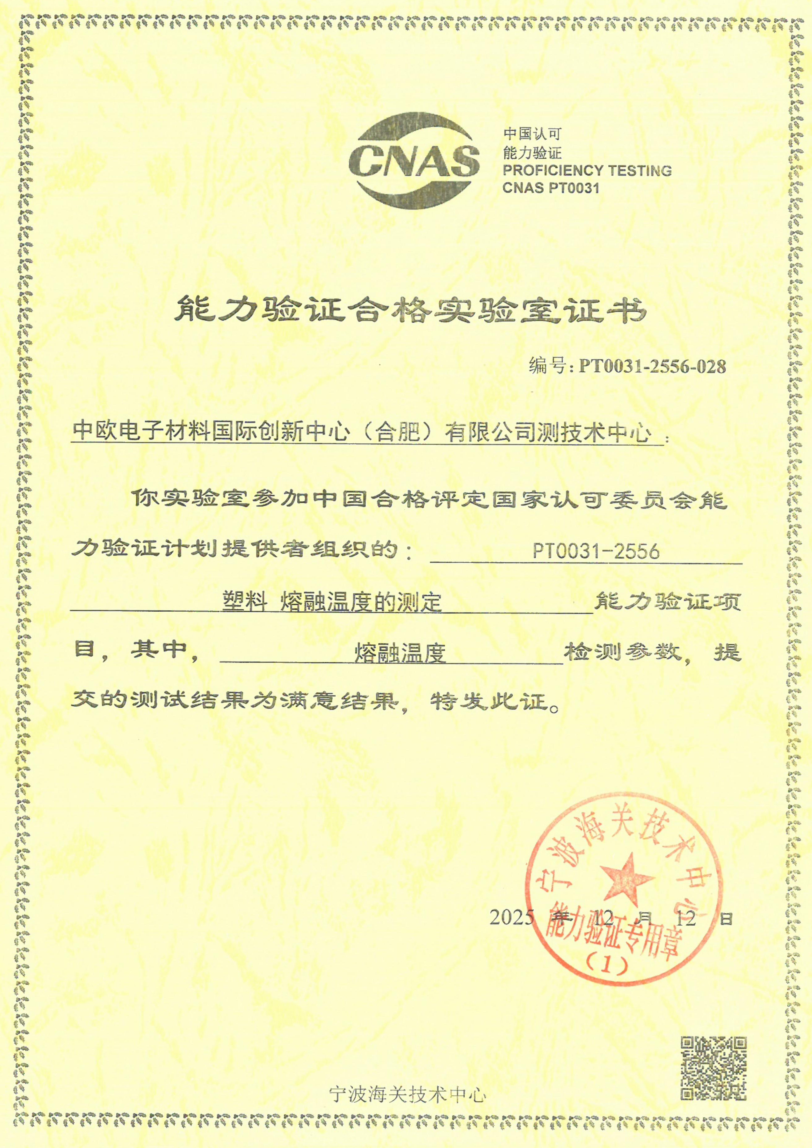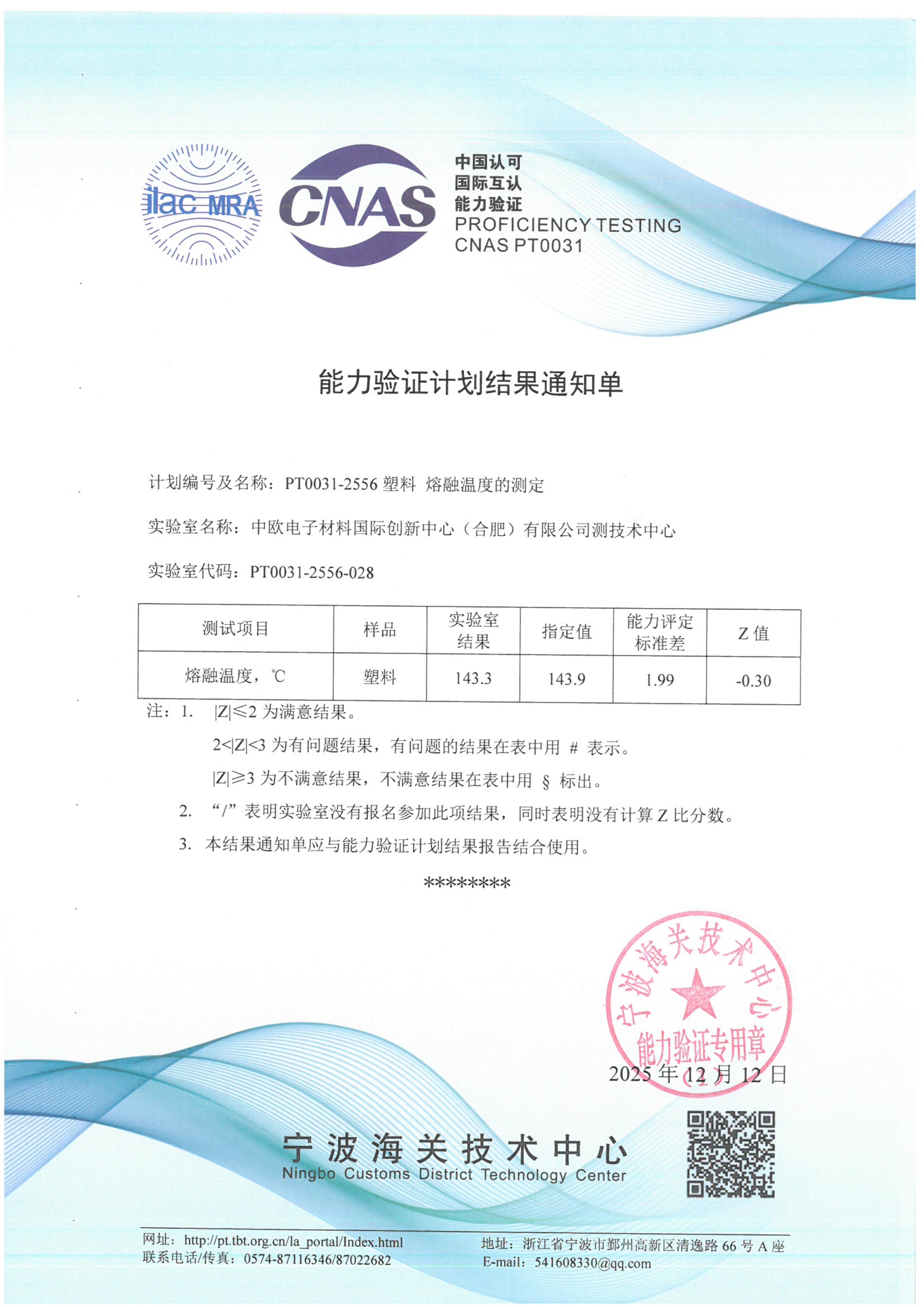近日,胜游·(中国)手机网页版测试技术中心实验室参加了CNAS PT 0031-2556 能力验证,顺利通过塑料熔融温度的测定,取得满意结果(z值为-0.30),通过能力验证,并获得CNAS能力验证合格实验室证书。